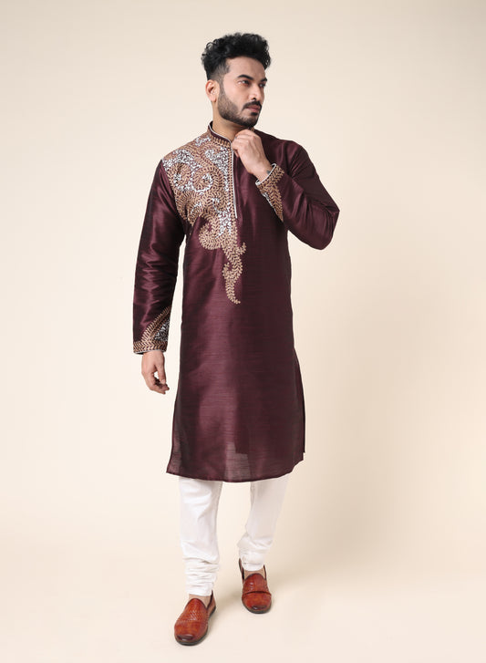 Rich maroon silk blend designer kurta with elegant gold embroidery, ideal for festive and wedding...