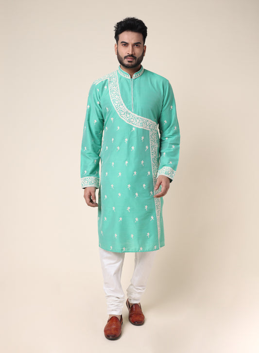 Vibrant emerald designer kurta with intricate white embroidery, perfect for festive occasions and traditional celebrations....
