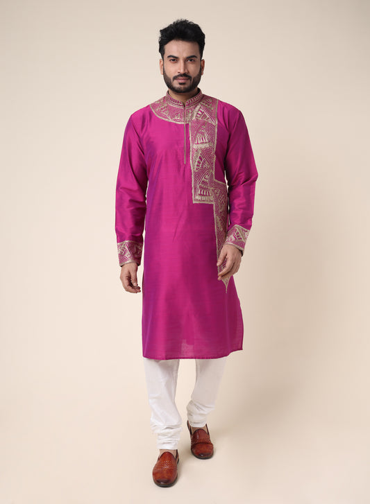 Rich magenta designer kurta featuring intricate gold embroidery on the front panel, collar, and cuffs....