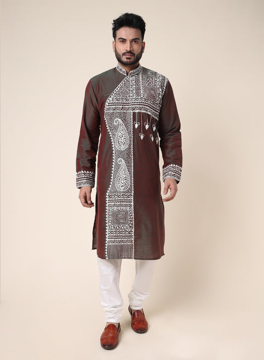 Classic brown designer kurta featuring intricate white embroidery with geometric and ethnic motifs. Ideal for...