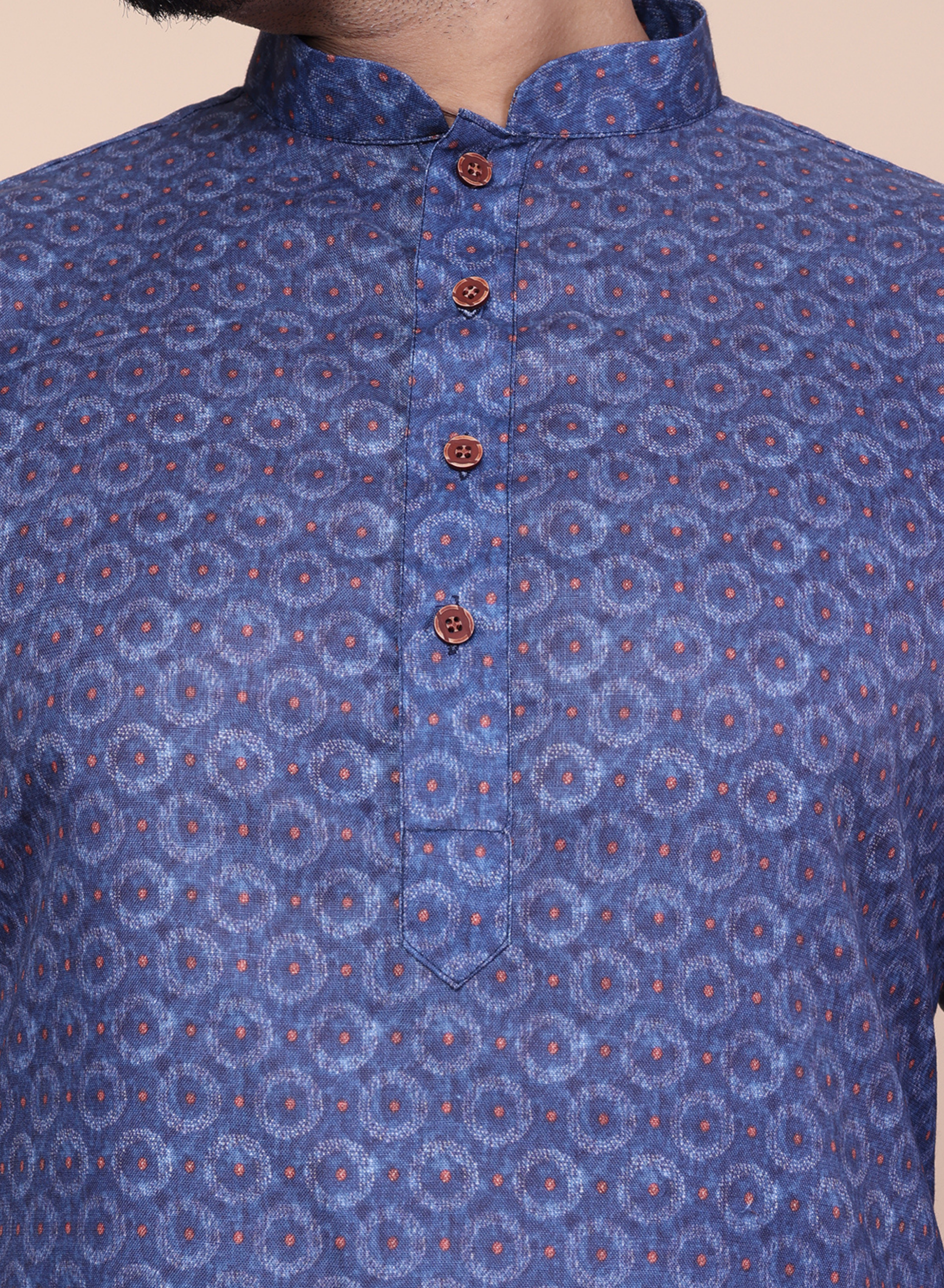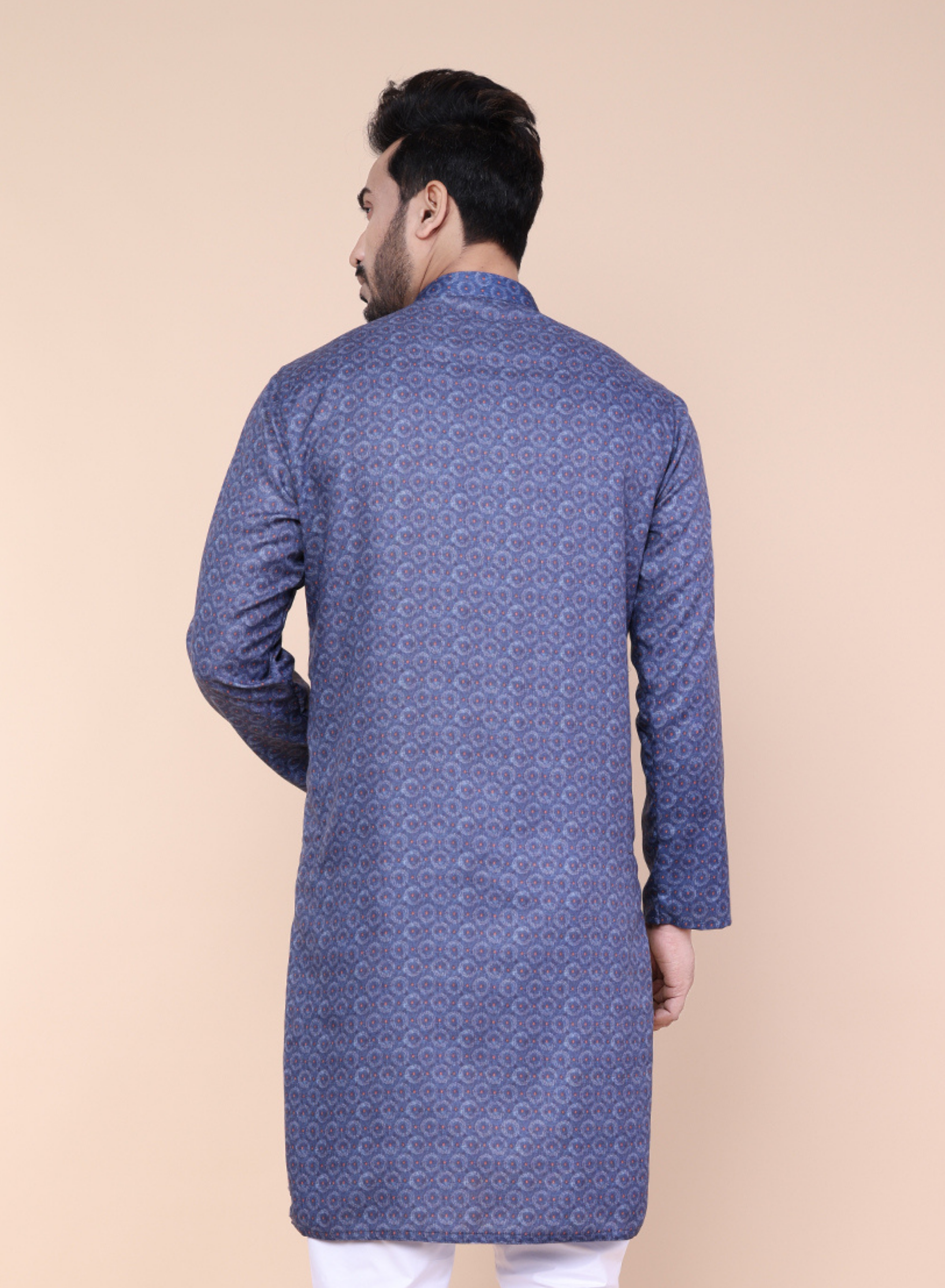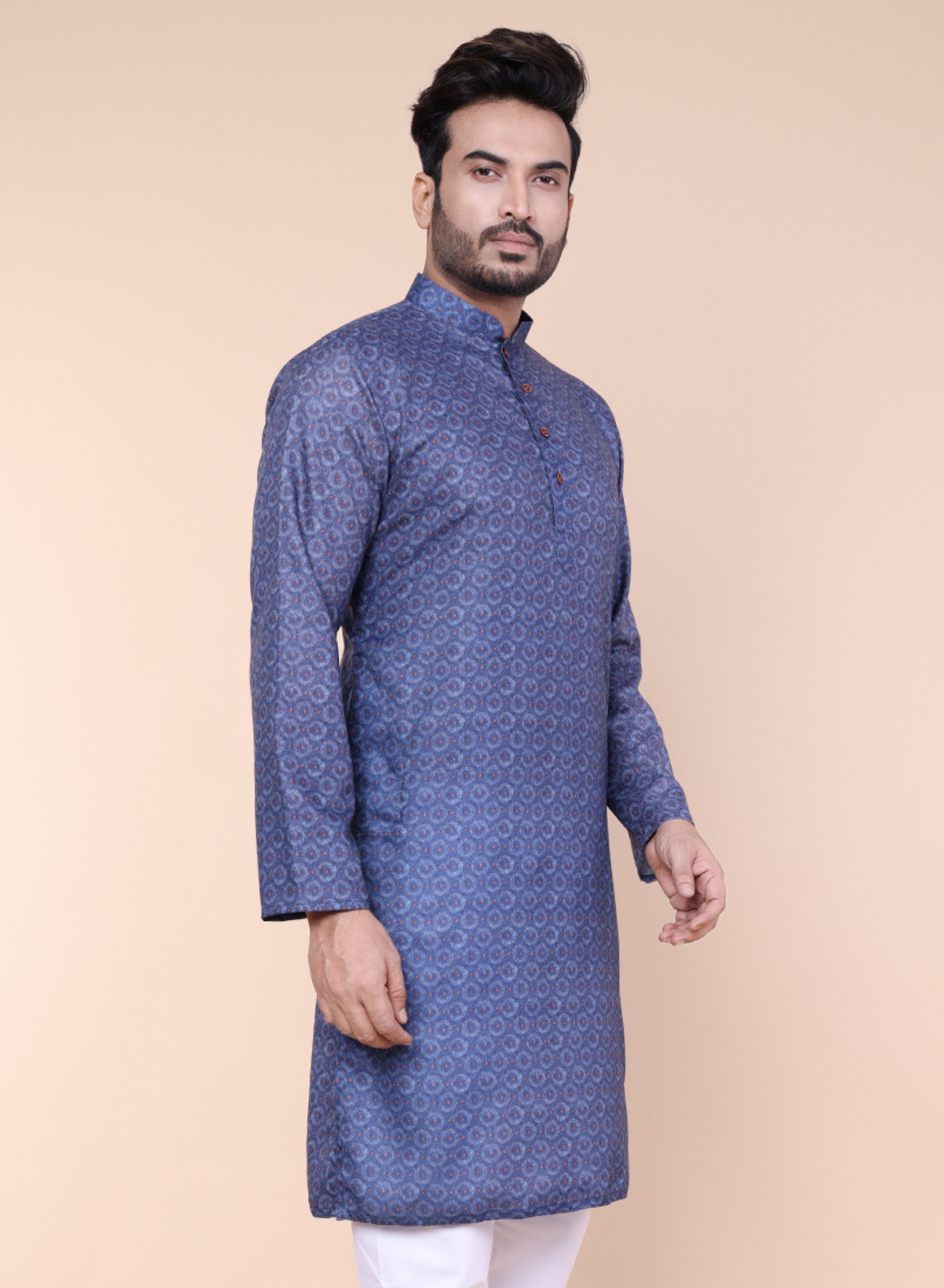 A refined cotton kurta featuring a subtle geometric print that adds a touch of style without overpowering the look. Finished with a neat mandarin collar and simple button detailing, it offers an elegant, understated design perfect for any occasion. Made in India.