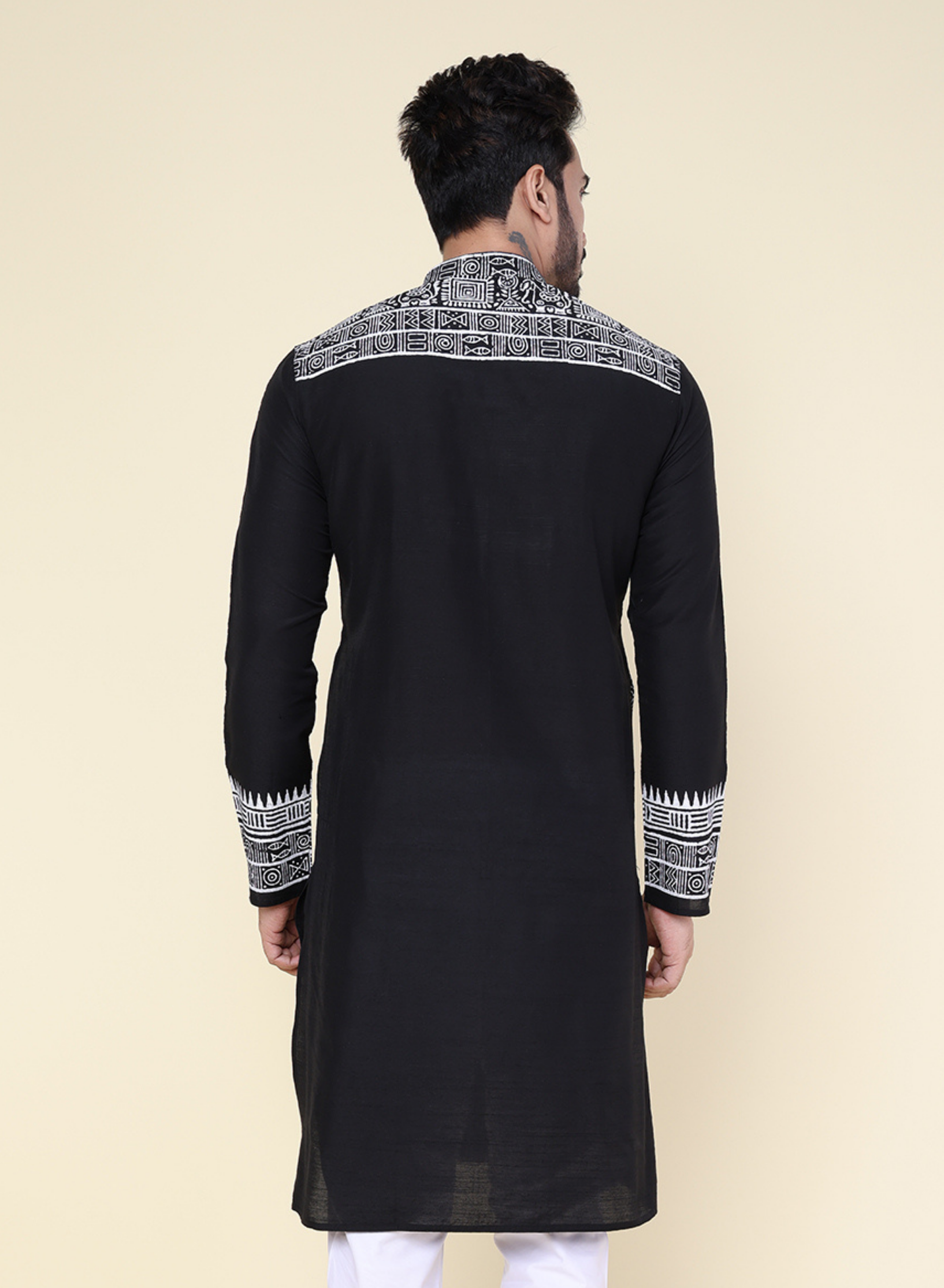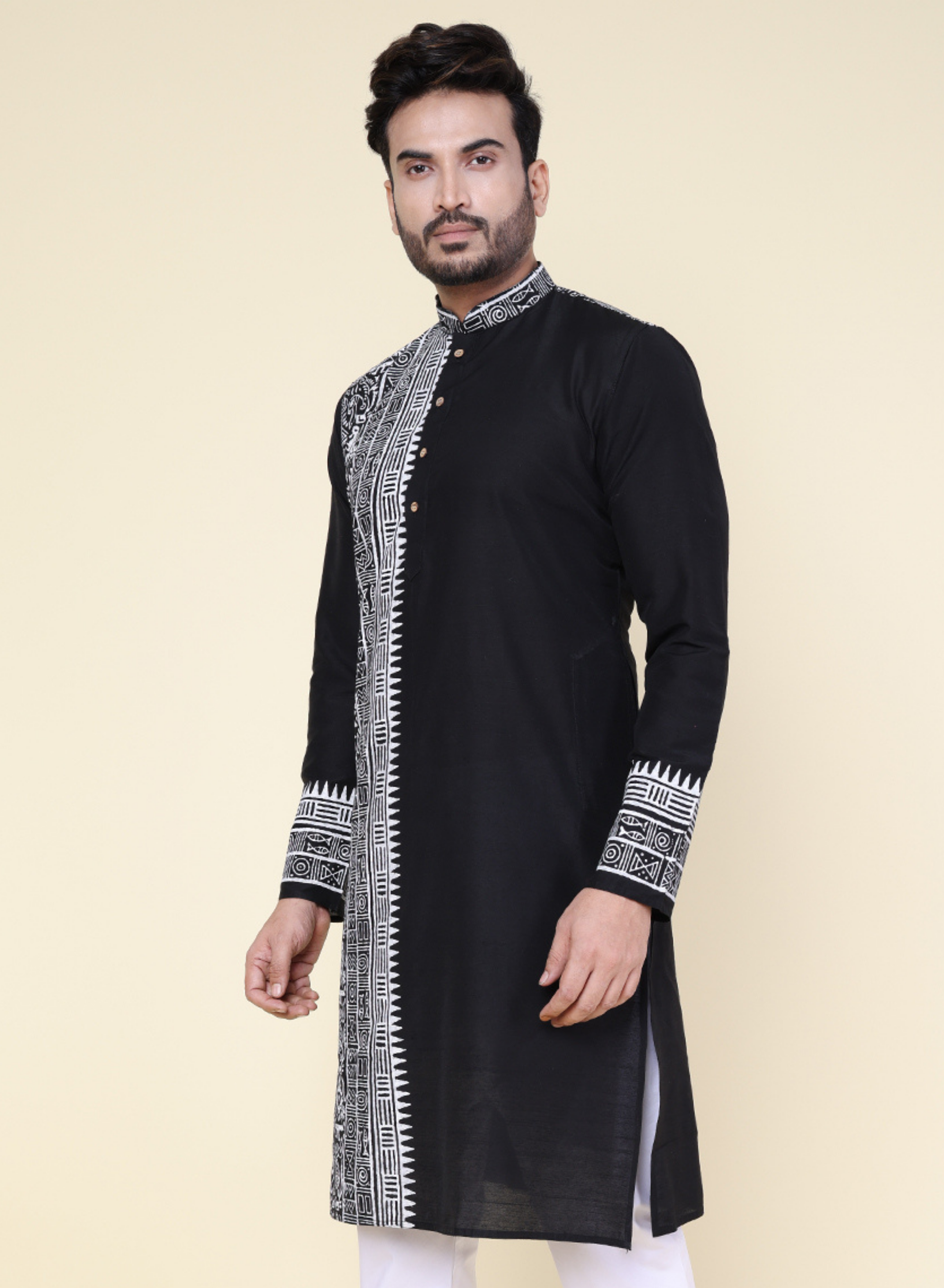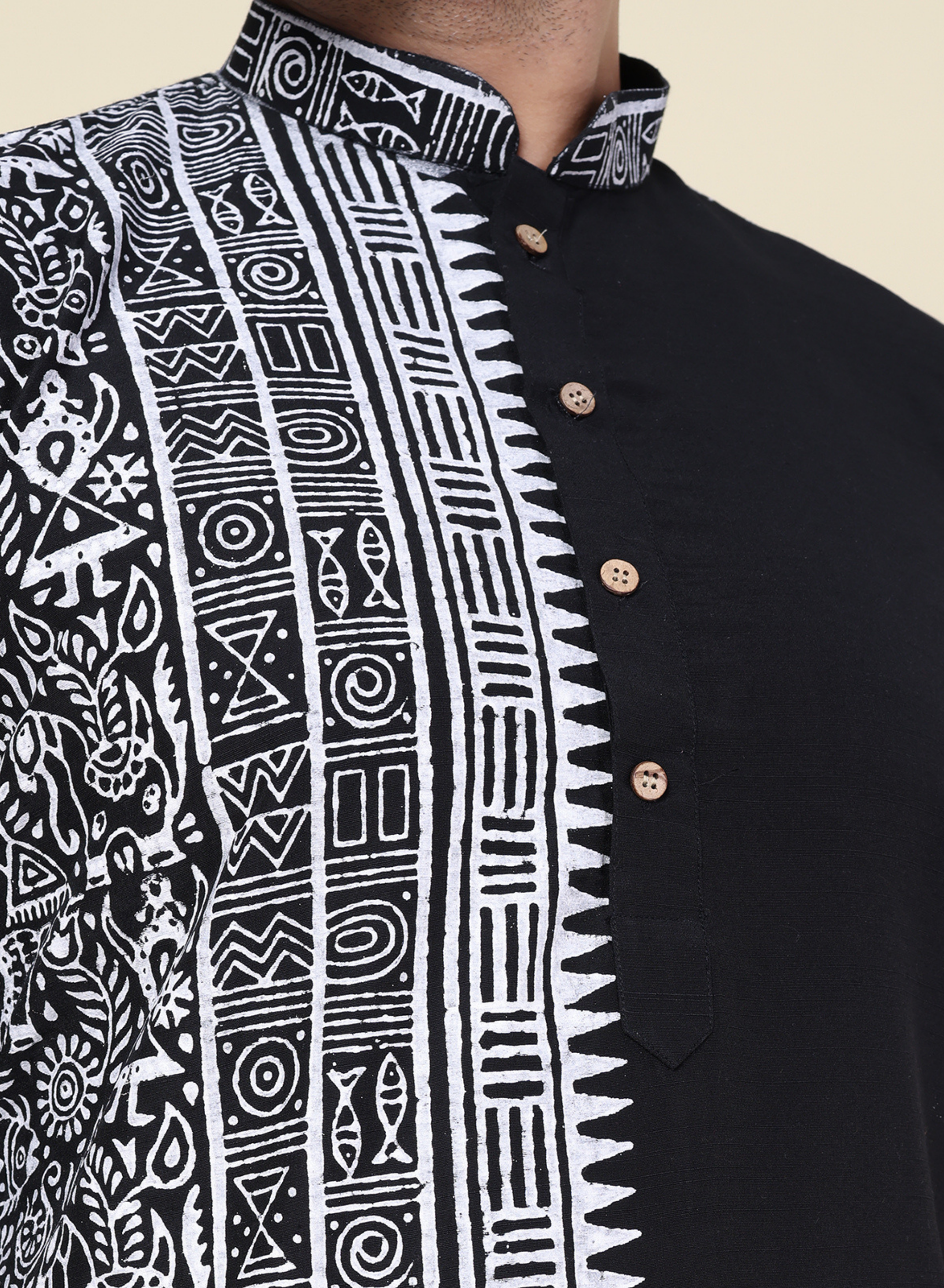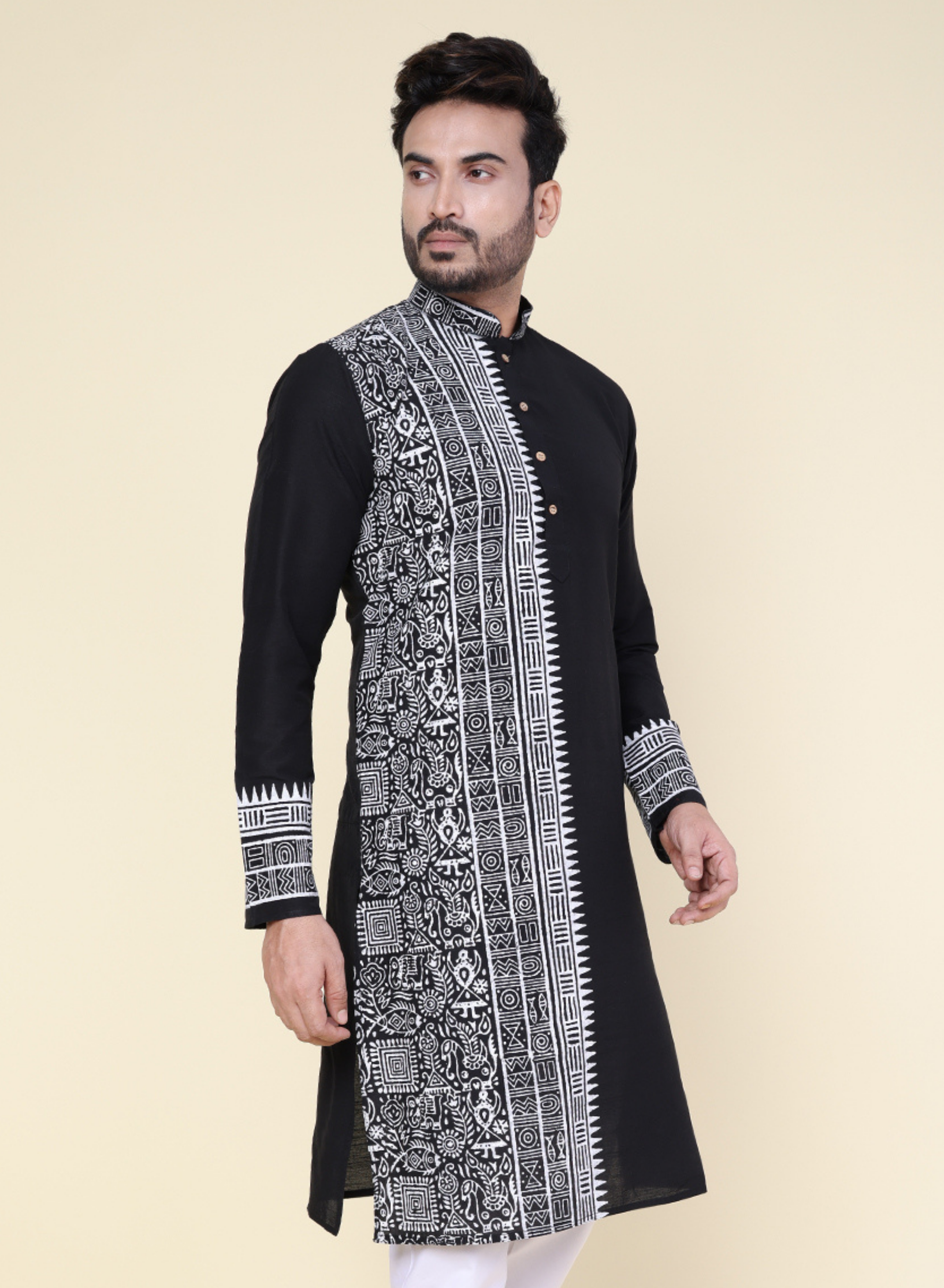 Men’s Black & White Ethnic Printed Cotton Kurta