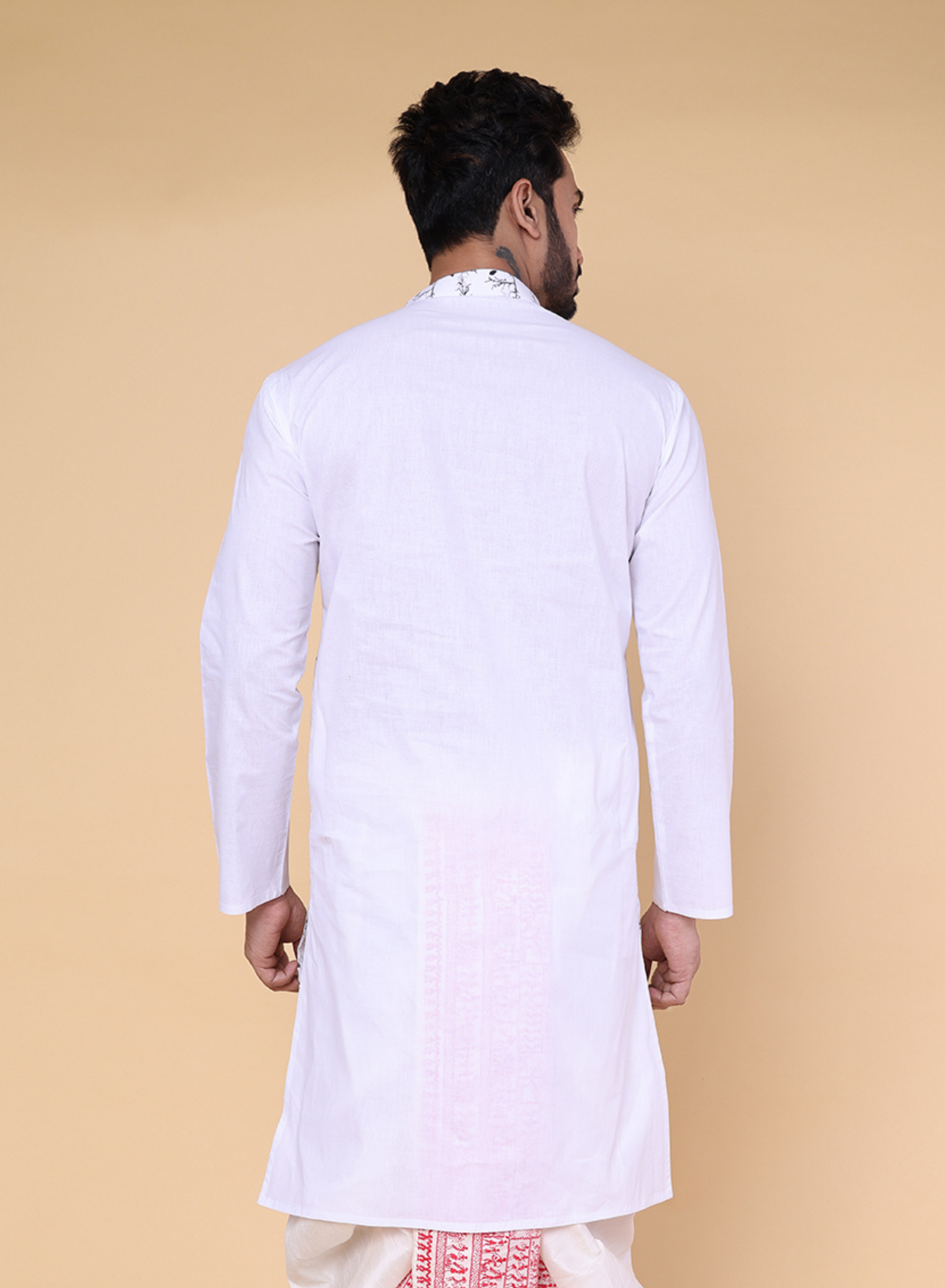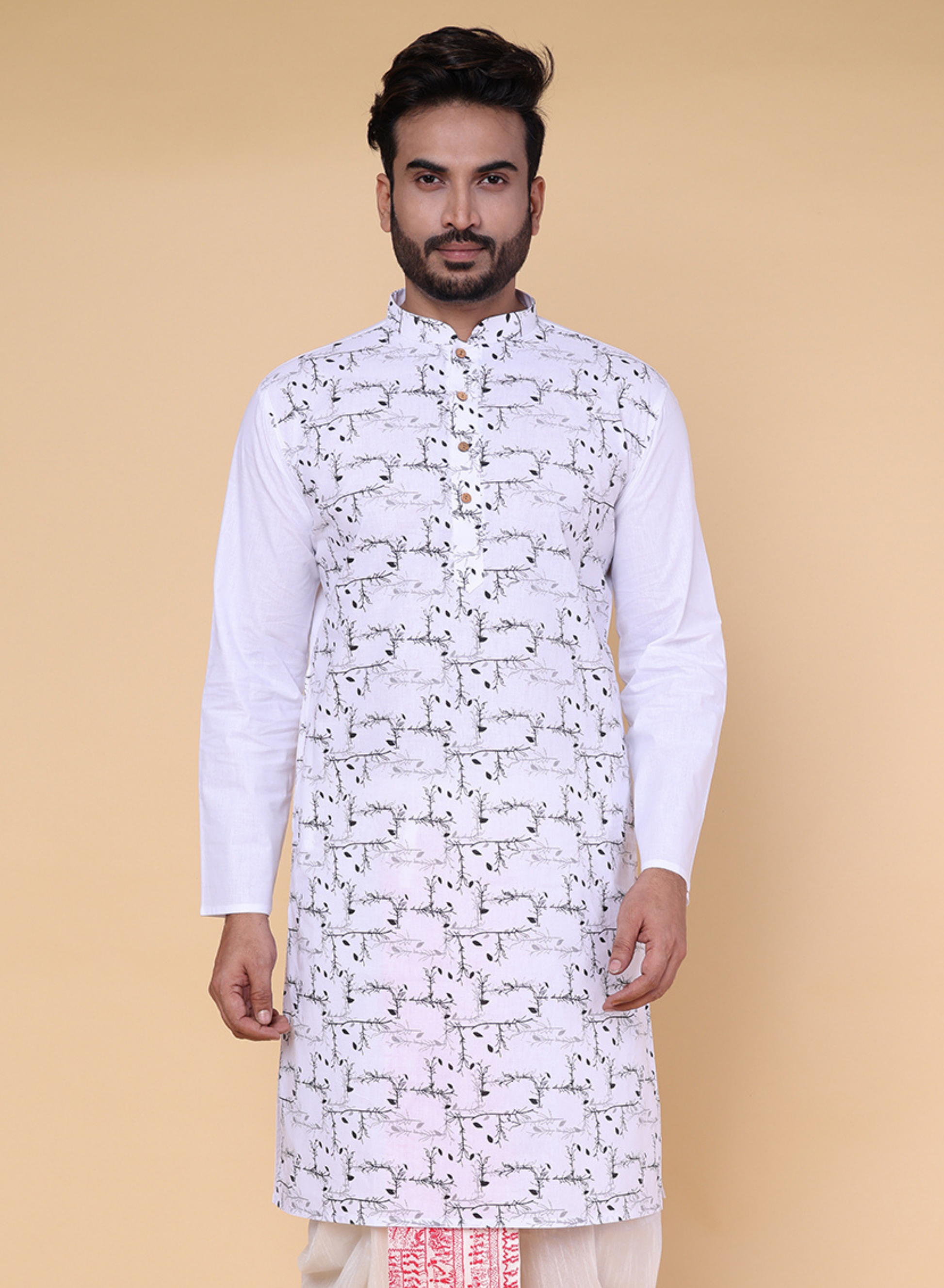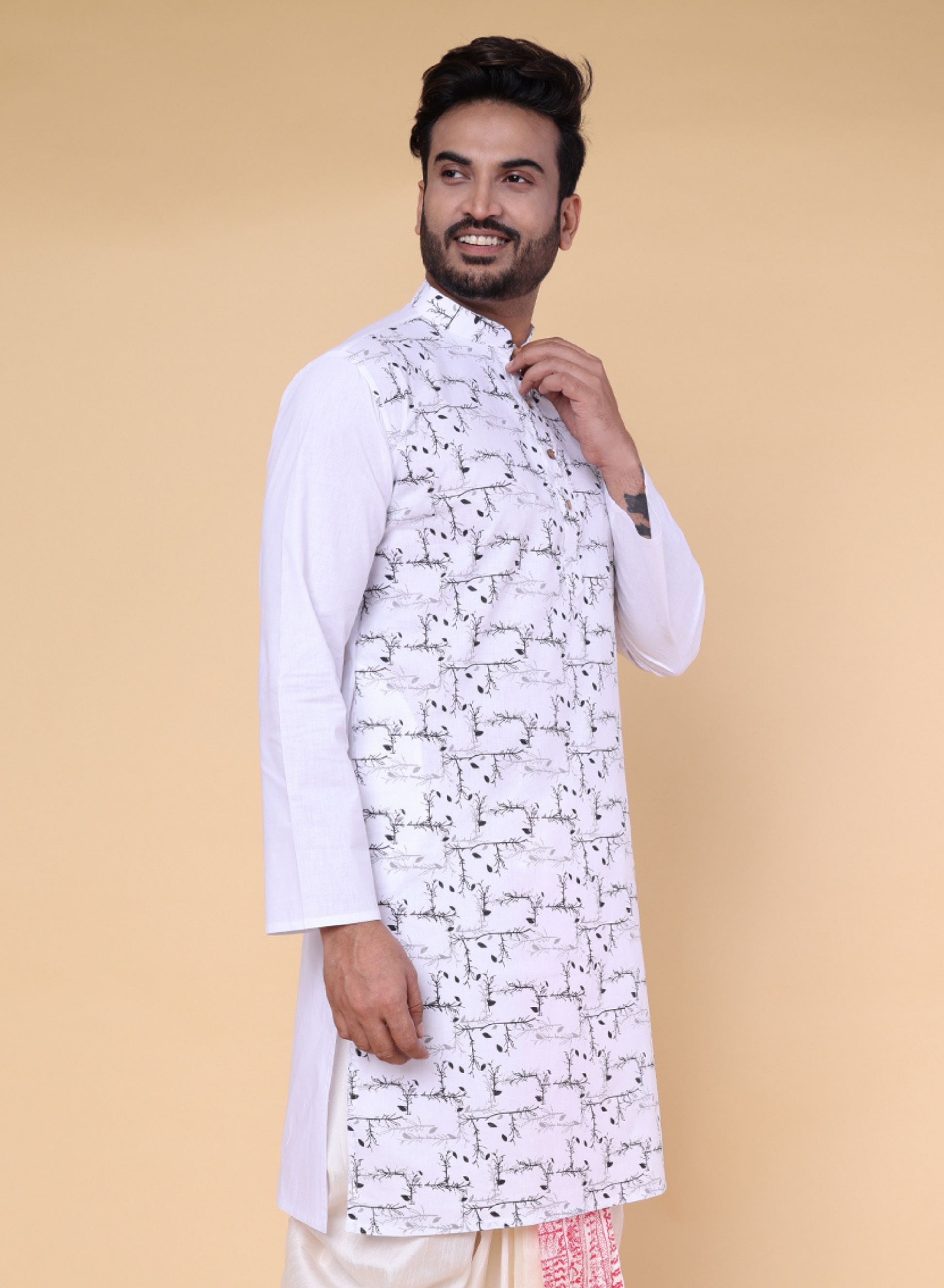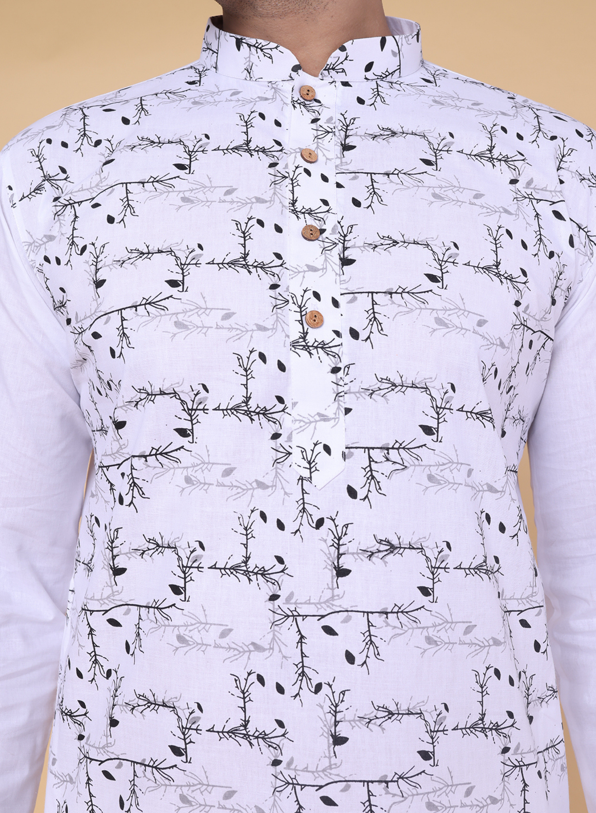 A clean white cotton kurta featuring a subtle black leaf pattern across the front for a refined, modern look. Finished with a mandarin collar and wooden buttons, it’s lightweight, stylish, and perfect for festive or everyday traditional wear. Made in India.