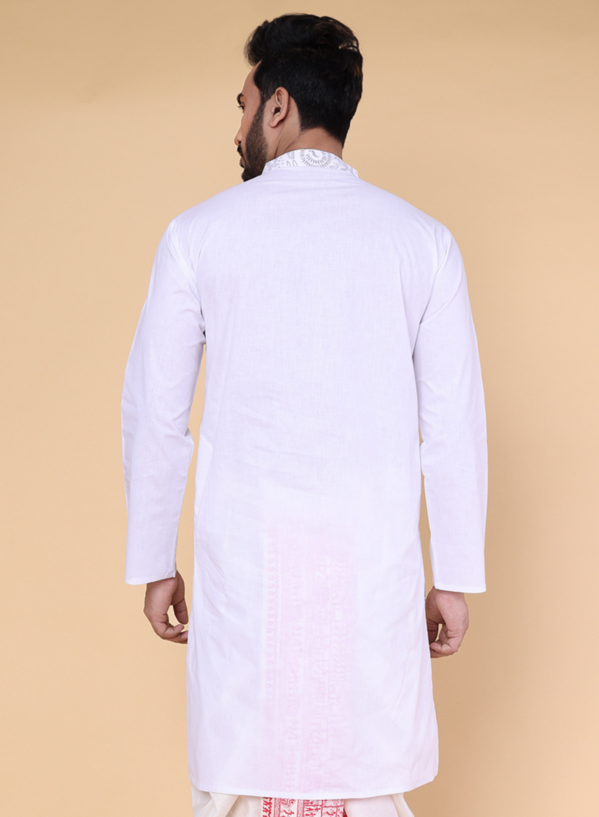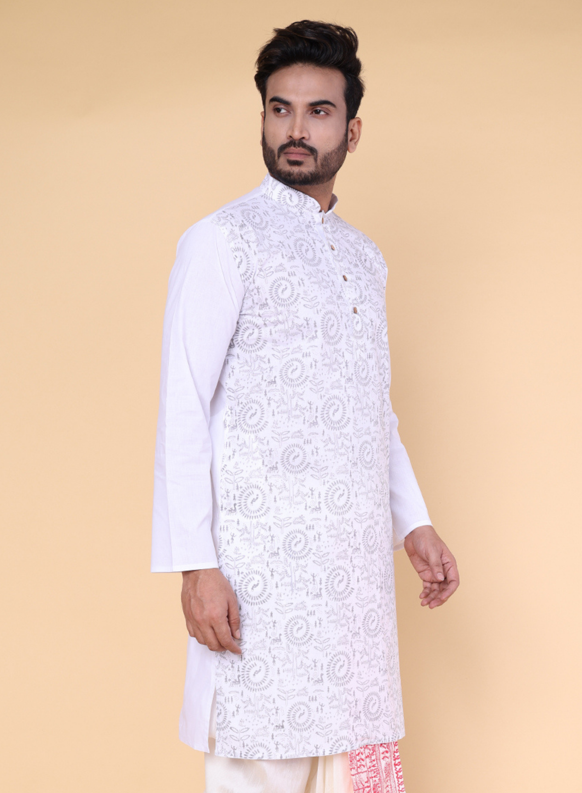 A crisp white cotton kurta with a subtle all-over print, styled with a mandarin collar and wooden buttons. Lightweight, elegant, and perfect for festive or everyday traditional wear. Made in India.