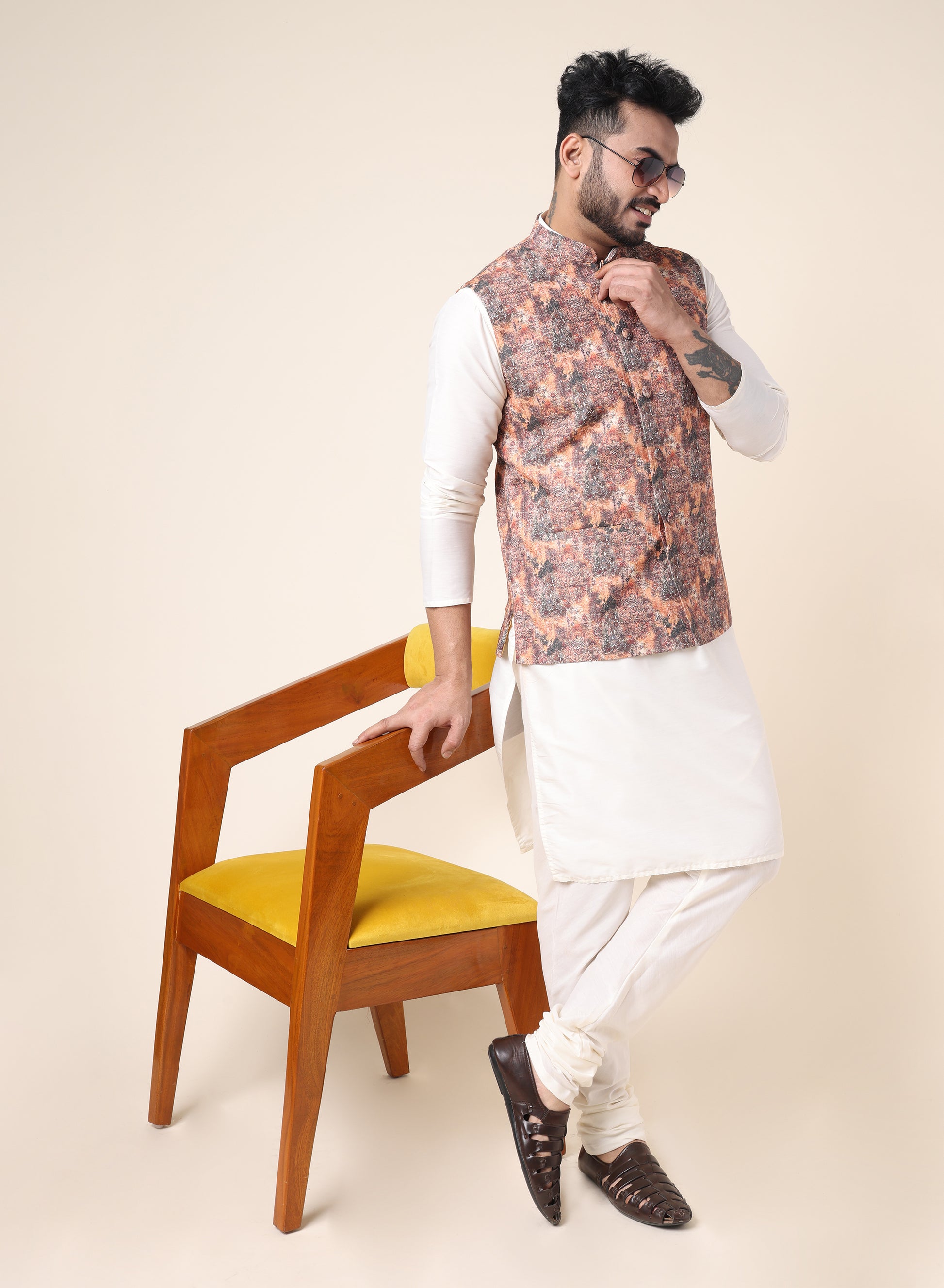 Men’s White Silk Kurta Pajama with Printed Jacket